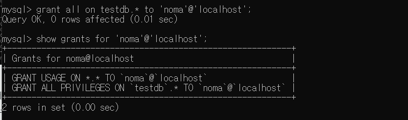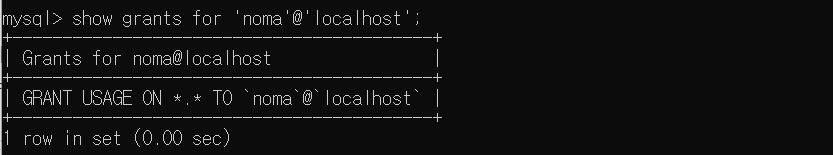 이제 사용자 'noma'에게 데이터베이스의 모든 권한을 부여해서, 권한을 확인해본다.