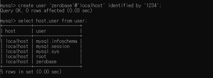 CREATE USER 'zerobase'@'localhost' indentified by '1234';