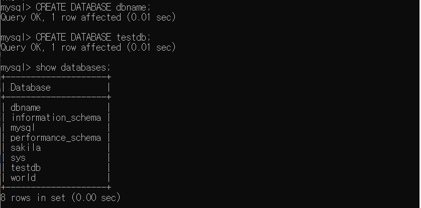 dbname과 testdb를 만들어, 데이터베이스 목록을 확인해보자.