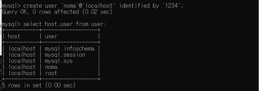 CREATE USER 'noma'@'localhost' identified by '1234';