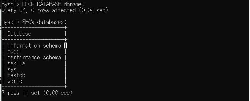 새로 만든 dbname 데이터베이스를 삭제한 후, 목록을 확인해보자.