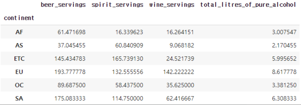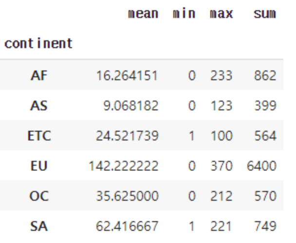 wine_servings 소비에 대해서 평균, 최소, 최대값, 합을 출력해보자.drink_df.groupby('continent').wine_servings.agg(['mean', 'min', 'max', 'sum'])