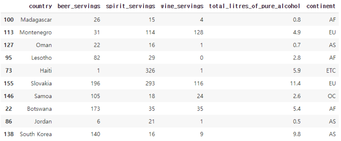 보고자하는 열을 별도로 명시해주지 않으면 모든 열이 출력됩니다. 앞서 'beer_servings'를 명시해주었을 때와는 다른 결과입니다.