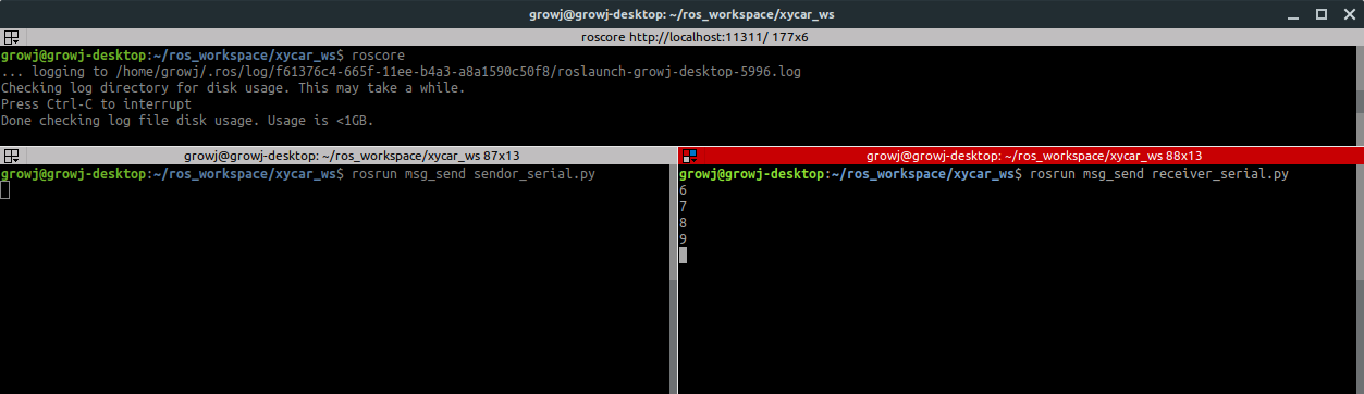 1부터 100까지 전송하는 노드인 sendor_serial.py와 메시지를 화면에 출력하는 receiver_serial.py를 만들고, 노드가 정상적으로 모두 도착하는지 확인했다.