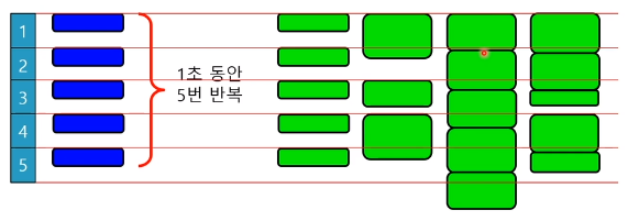 rate를 5로 했을 때 하나의 타임슬롯은 0.2초가 된다. count만큼 for문을 실행했을 때, 1000번의 경우 1초를, 85,000번의 경우 1.35초의 시간이 소모되고, 일부 슬롯의 경우 작업을 하지 않고 넘어가는 것을 볼 수 있다.