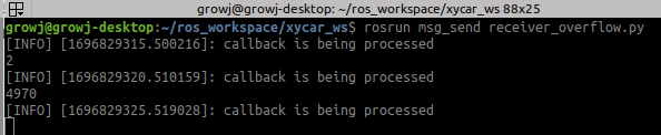 queue_size를 1로 했을 때, 일부 토픽을 잃어버리는 것을 볼 수 있다. 이는 queue_size를 충분히 부여해주면 해결되는 문제이다. 하지만, queue_size는 그만큼의 데이터를 보관한다는 뜻이며, 오히려 이 때문에 과도한 메모리를 소모하거나 실시간성을 잃어버리는 문제가 발생할 수 있기 때문에 적절한 queue_size를 지정하는 것이 중요하다.