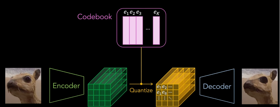 -> 각각의 features in the encoded output 들은 in lantspace (Ze) Codebook 에 구성요소들 e_i 에서 L2 Norm 으로 가까운 얘들로 replace 해당 z 가 e 로 바뀌게 되어진다.