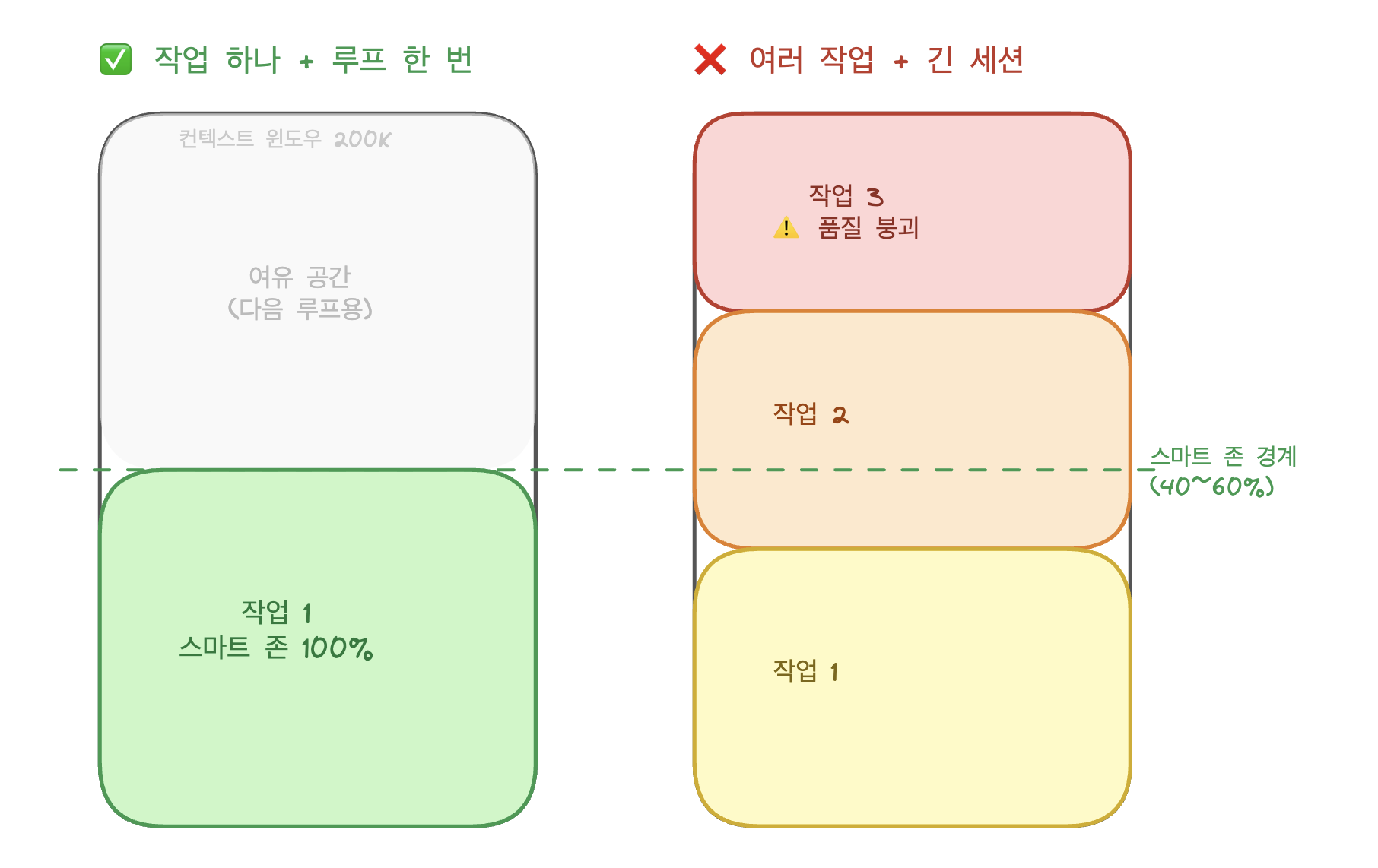 Huntley가 실험으로 도출한 수치를 보면, Anthropic이 200K 토큰이라고 광고하는 컨텍스트 윈도우에서 실제 추론에 활용되는 범위는 40~60%에 그친다고 합니다. 이 구간을 '스마트 존'이라 부릅니다. 작업 하나에 전체 컨텍스트를 집중하면 AI는 스마트 존 안에서 계속 작동합니다.