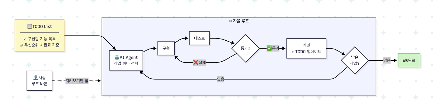 루프 안에 있다는 건 매 결정에 개입한다는 뜻입니다. AI가 작업을 선택할 때, 구현 방식을 고를 때, 테스트 결과를 해석할 때 사람이 참여합니다. 기존의 AI 코딩 어시스턴트 활용 방식이 대부분 이렇습니다. 겉보기엔 빠른 것 같아도, 루프가 돌 때마다 사람의 판단을 기다려야 하니 결국 사람이 병목이 되고 AI는 혼자 달릴 수 없습니다.