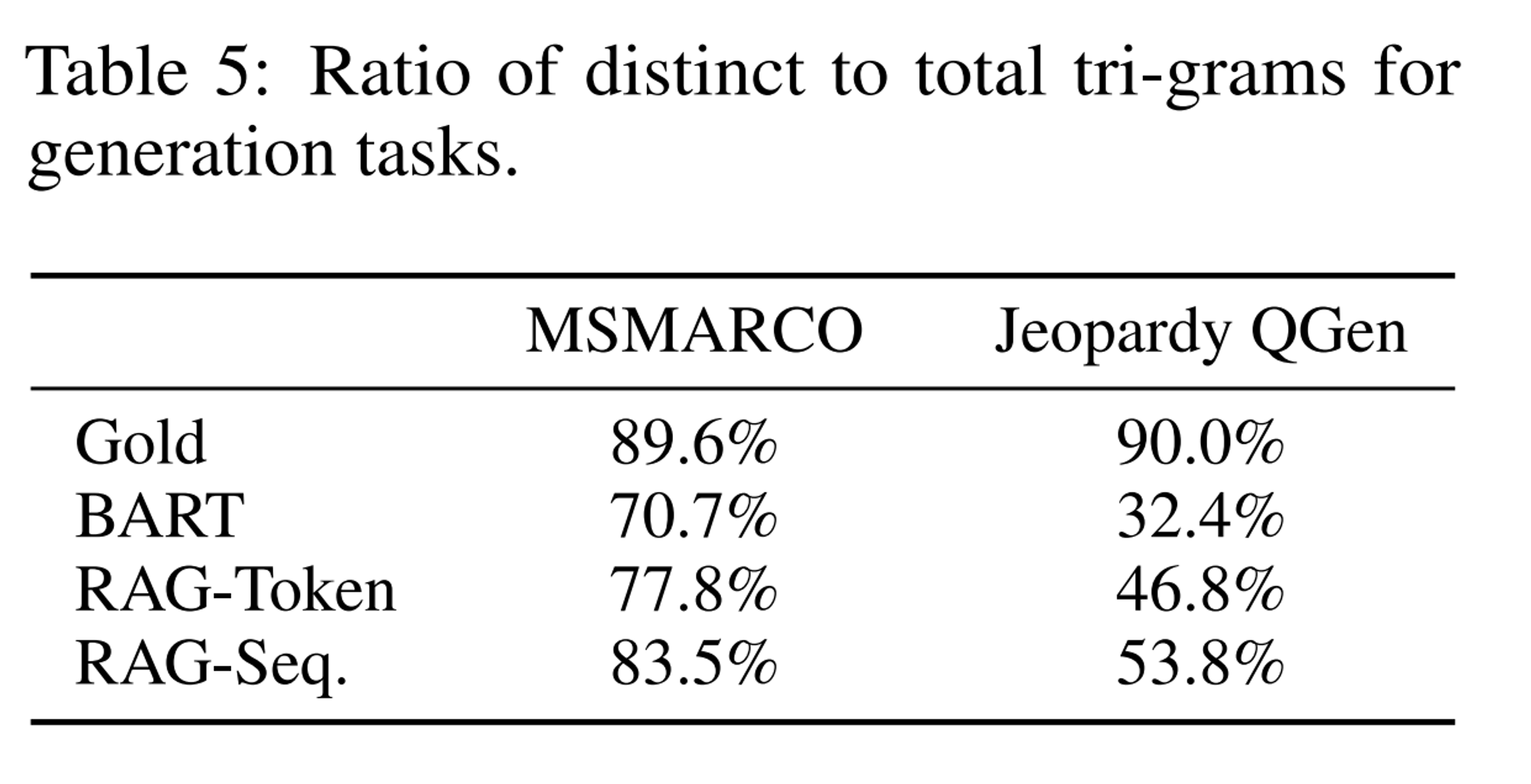 Jeopardy 태스크에서 RAG 모델이 BART 모델보다 사실 기반 생성 능력이 뛰어나다는 것을 알 수 있었다. 서로 다른 모델에서 생성 다양성을 평가하기 위해 전체 앵그램을 개별 앵그램으로 나눈 비율을 측정하였다.