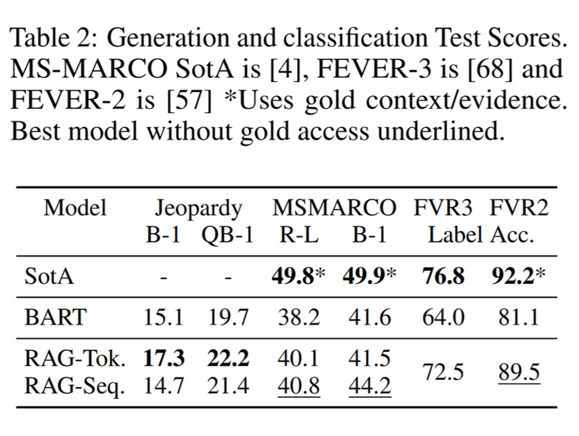 MSMARCO NLP 태스크에서 RAG 모델은 BART보다 뛰어난 성능을 보인다.