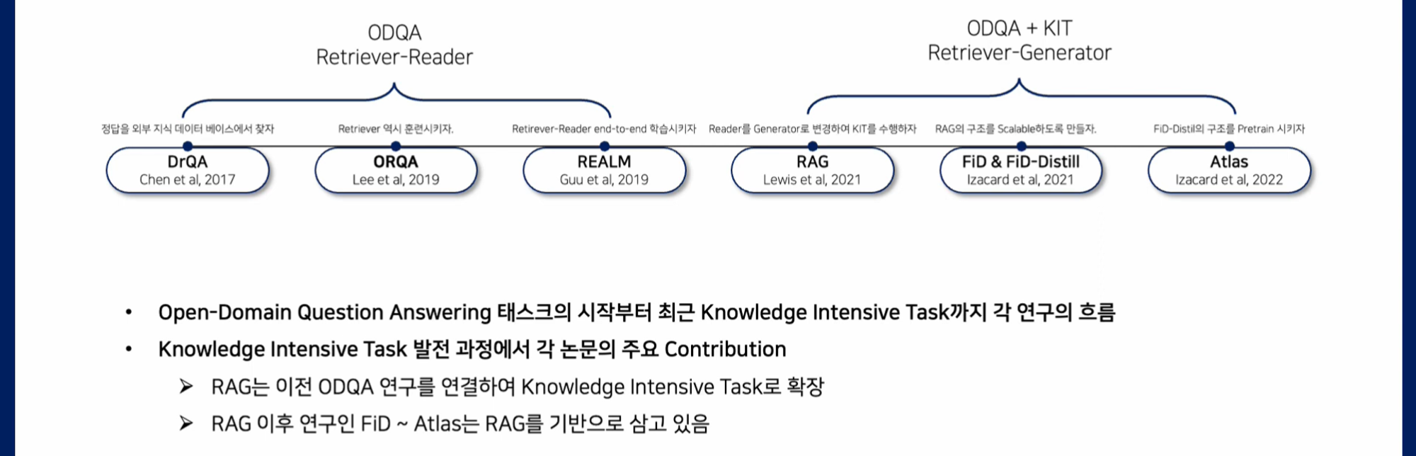 이후 RAG가 등장하는데, ODQA와 KIT(Knowledge Intensive Task)를 이어주는 모델로 Retriever 뿐만 아니라 Generator(생성기)도 함꼐 학습시킨 것이다.