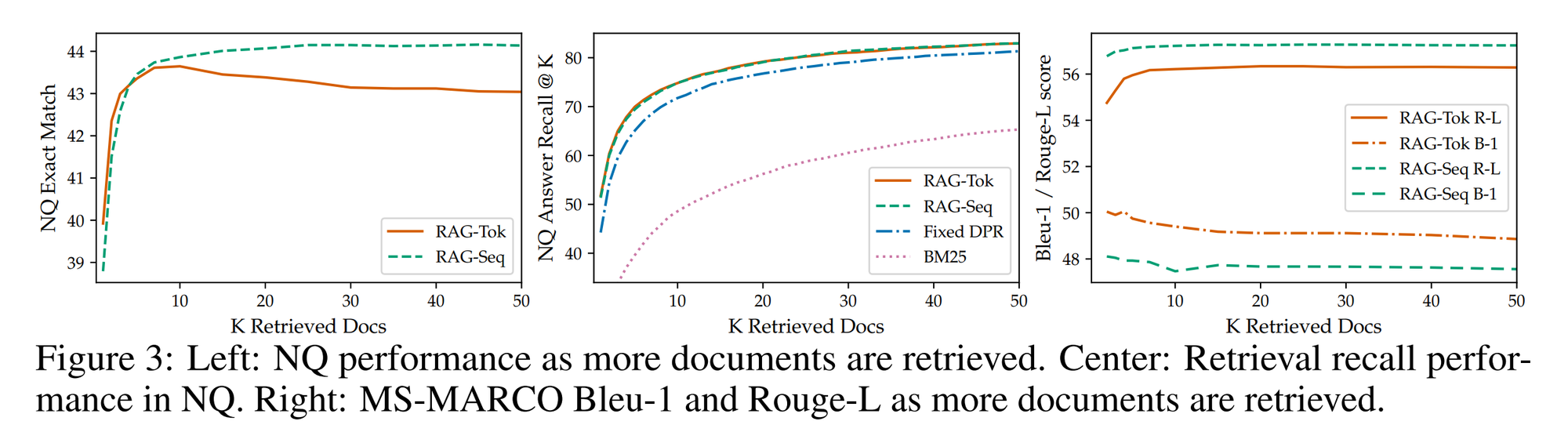 RAG-Sequence는 대체적으로 문서의 개수가 늘어남에 따라 성능이 더 좋았는데 RAG-Token의 경우 10에서 최고점을 찍고 내려가는 모습을 보였다. 일반적으로는 더 많은 문서를 사용할 수록 높은 점수를 보임을 알 수 있었다.