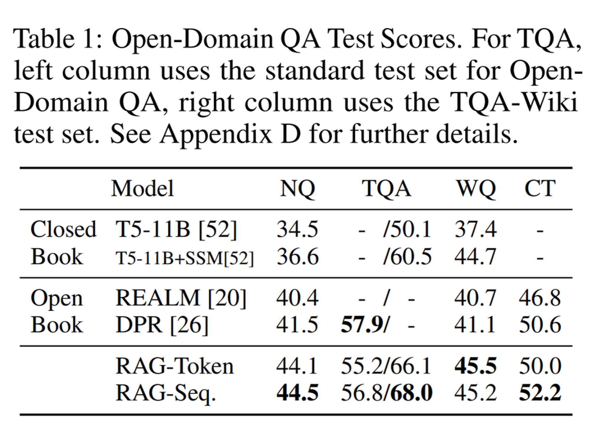 Table1의 모델들은 다음과 같다. 우선 Closed Book은 모델이 외부 지식이나 문서 없이 학습된 지식을 가지고 질문에 답하는 방식이다. 이때 T-5-11B+SSM은 T5모델에 추가적인 사전 학습이 더해진 버전이다. Open Book은 외부 지식을 사용한 것인데 그중에서도 REALM과 DPR은 주로 Retriever, 검색 단계에 집중한 모델이다. 반면 RAG-Token과 RAG-Seq은 retrieval 뿐만 아니라 Generation 단계 역시 거친다.