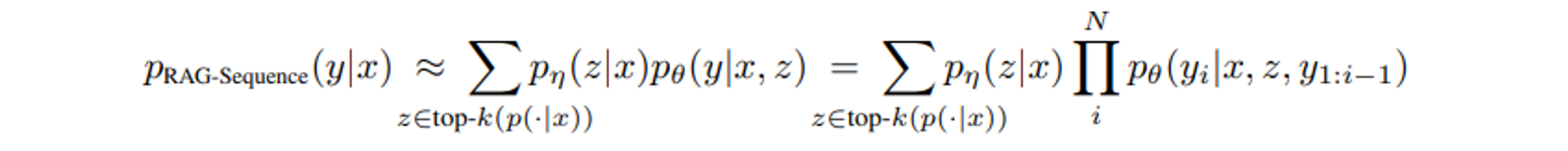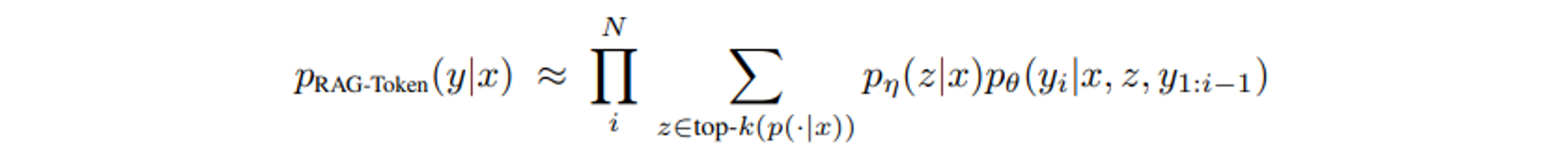 이 두 모델을 결합하여 RAG 모델은 전체적인 생성과정을 end-to-end 방식으로 학습할 수 있다. 두 번째 식은 위의 식을 i번째 단어로 표현한 것이다.