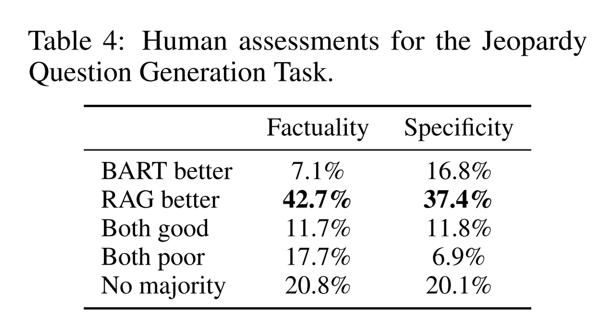 Table 4는 RAG 와 BART의 출력을 사람이 비교한 결과이다. BART가 더 사실적인 경우는 7.1%인데 비해 RAG가 더 사실적인 경우는 42.7%에 달한다.