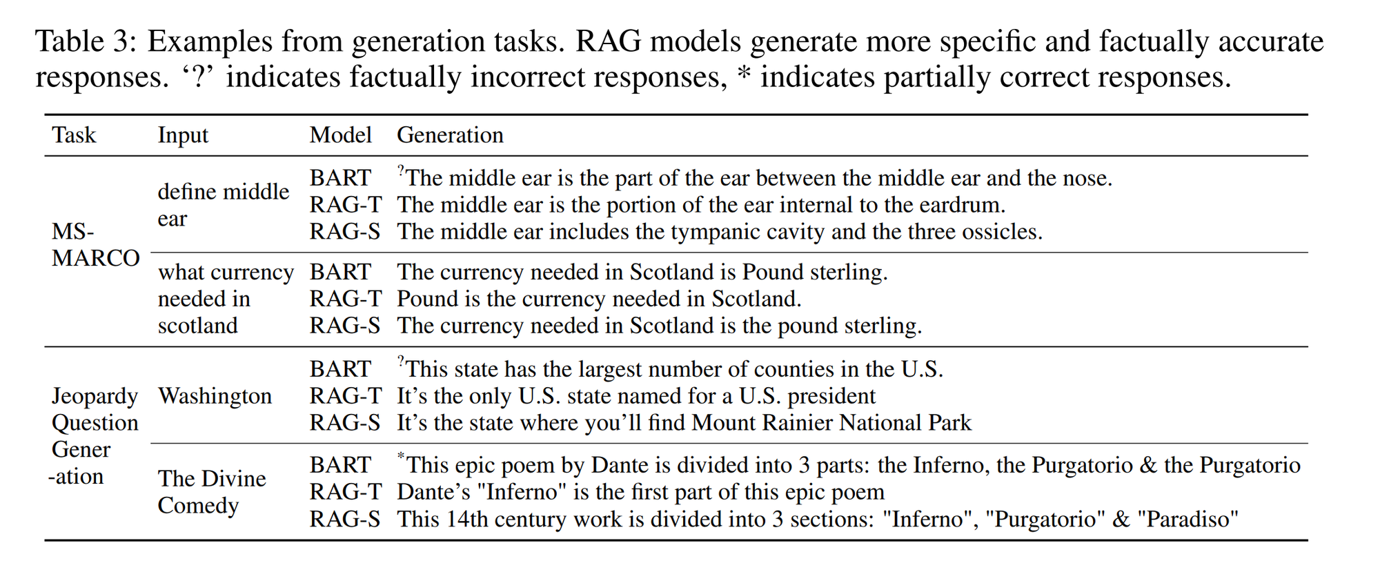 위의 표는 RAG와 BART가 생성한 정답의 예시이다. RAG가 BART보다 사실에 근거한 답을 생성하며 환각이 덜 발생함을 알 수 있다.