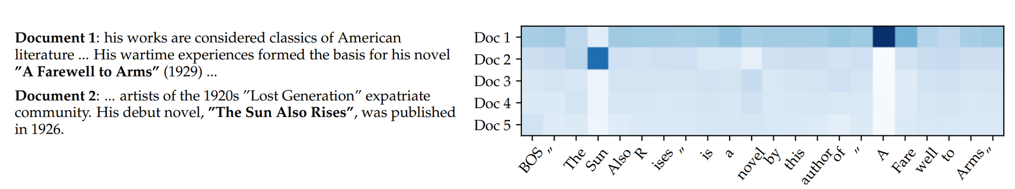 해당 그림은 RAG-Token 모델이 특정 입력에 대해 Jeopardy 문제를 생성할 때 각 토큰에 대해 5개의 검색된 문서의 사후 확률을 어떻게 사용하는지 보여준다. 그림의 열은 각 토큰에 대해 5개의 문서가 선택된 후, 각 문서의 사후 확률을 나타내는 히트맵이고 각 셀은 특정 토큰을 생성할 때 문서가 얼마나 관련성이 높은지를 나타낸다.