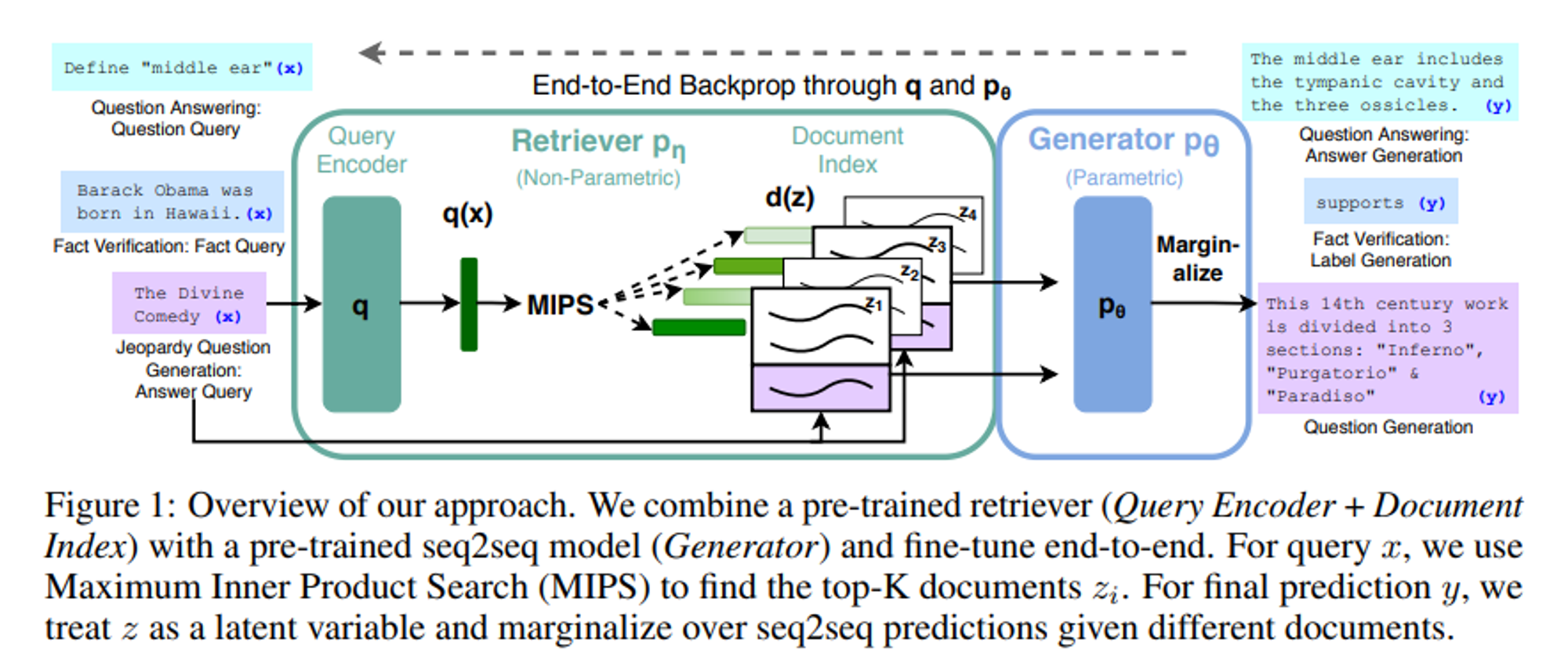 RAG는 input sentence인 x가 들어오게 되면 non-parametric 메모리에서 관련된 문서인 z를 찾고, 이를 활용하여 target sentence인 y를 생성한다.