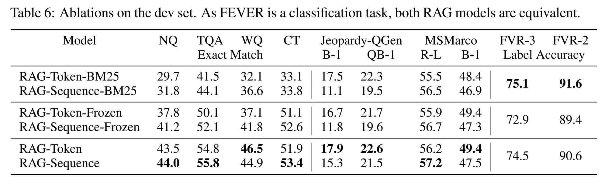 RAG-Token-BM25는 RAG의 Retriever인 DPR을 BM25로 변경한 것이고 RAG-Token-Frozen은 BART의 파라미터만 업데이트하고 Retriever는 파인튜닝하지 않은 것이다.