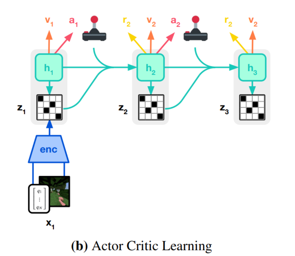๋ณธ ๋ ผ๋ฌธ์์๋ ์ธ๊ณ ๋ชจ๋ธ์ ์ ๊ทธ๋ฆผ์์ ๋ณด๋ ๊ฒ์ฒ๋ผ ์ํ ์ํ ๊ณต๊ฐ ๋ชจ๋ธ(recurrent state-space model)๋ก ๊ตฌํํ๋ค. ์ฐ์ encoder๋ ๊ฐ๊ฐ ์ ๋ ฅ ๋ฅผ ํ๋ จ ์ํ์ค์์ ๊ฐ time step ์ ๋ํ ํ๋ฅ ์ ํํ ๋ก mappingํ๋ค. ๊ทธ ๋ค์ ์ํ ์ํ ๋ฅผ ๊ฐ๋ ์ํ์ค ๋ชจ๋ธ์ ๊ณผ๊ฑฐ action ์ด ์ฃผ์ด์ก์ ๋ ์ด๋ฌํ ํํ๋ค์ ์ํ์ค๋ฅผ ์์ธกํ๋ค. ์ ์ concatenation์ ๋ชจ๋ธ ์ํ๋ฅผ ํ์ฑํ๊ณ , ์ด๋ฅผ ํตํด ๋ณด์ ์ episode ์ง์ flag ๋ฅผ ์์ธกํ๊ณ ์ ๋ ฅ๊ฐ์ ์ฌ๊ตฌ์ฑํด์ ์ ๋ณด๋ ฅ์ด ๋์ ํํ์ ๋ณด์ฅํ๋ค.