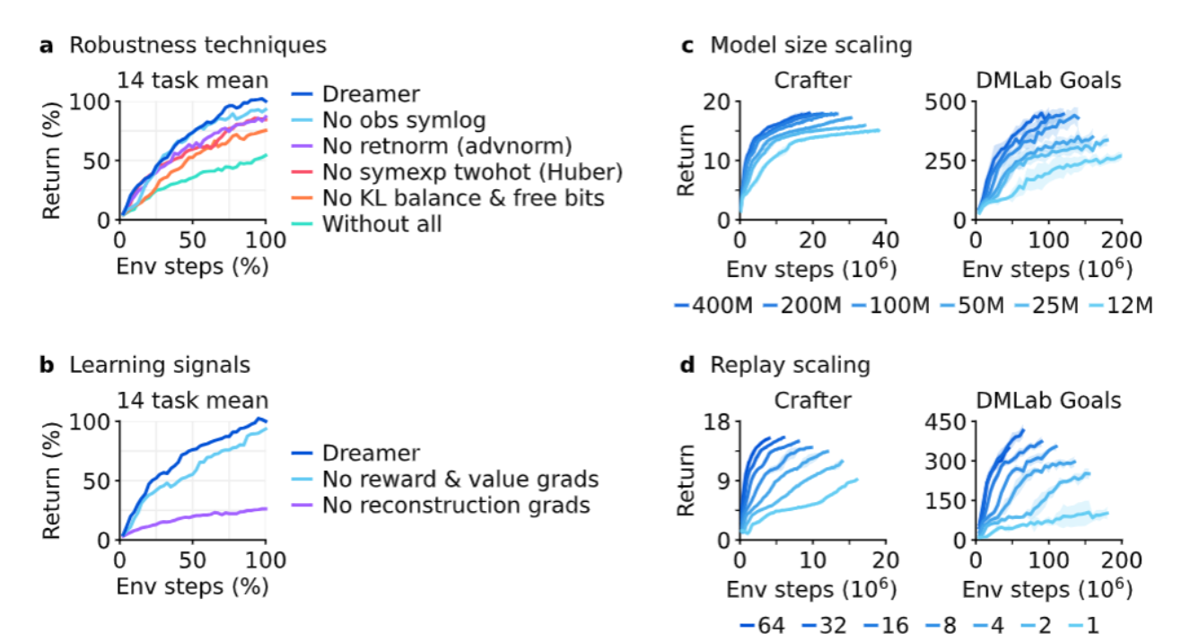 Dreamer๋ ๋ค์ํ ๋๋ฉ์ธ์์ PPO๋ณด๋ค ํจ์ฌ ๋ฐ์ด๋ ์ฑ๋ฅ์ ๋ณด์ฌ์คฌ๋ค.