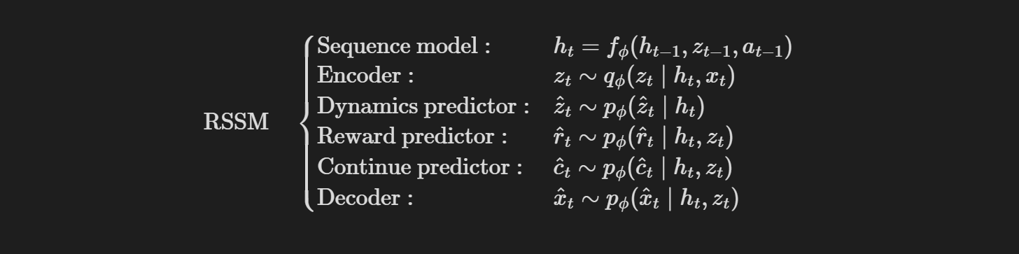 ์ผ๋จ world model์ด ๋ญ์ง๋ถํฐ ์์๋ณด์. ์ฌ๊ธฐ์ ๋งํ๋ world model์ด๋ ๊ฐํ ํ์ต ์์ด์ ํธ๊ฐ ํ๊ฒฝ ์์ฒด๋ฅผ ํ์ตํ์ฌ ์ดํดํ๋ ๋ชจ๋ธ์ ์๋ฏธํ๋ค. ๊ทธ๋ฌ๋๊น ์ฌ๋์ด ์ฃผ๋ณ ์ธ์์ ๊ด์ฐฐํ๊ณ ๊ฒฝํํด์ ์ธ์์ ๊ท์น์ด๋ ์ญํ์ ๋ฐฐ์ฐ๋ ๊ฒ๊ณผ ๋น์ทํ๋ค. ์ด World model์ ๊ฐ๊ฐ(sensory) ์ ๋ ฅ์ ์์ถ๋ ํํ๋ก ํ์ตํ๋๋ฐ, ์ด๋ RSSM(Recurrent State-Space Model)์ ์ฌ์ฉํ๋ค.
