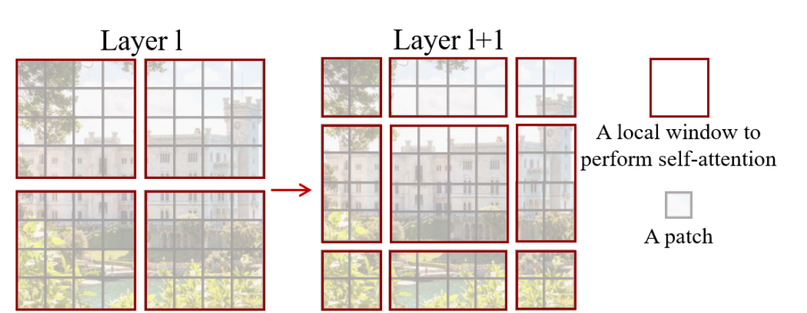 - 일반 Transformer의 경우 256X256 이미지를 16X16 패치로 나누면 총 256개의 패치가 생긴다. 모든 패치에 대해 self-attention을 하면 계산량은 256X256 = 65,536이 된다. ==계산량 O(N^2)==
