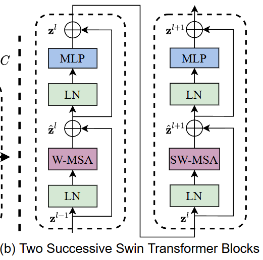 W-MSA -> MLP -> SW-MSA -> MLP 이렇게 번갈아서 사용!!