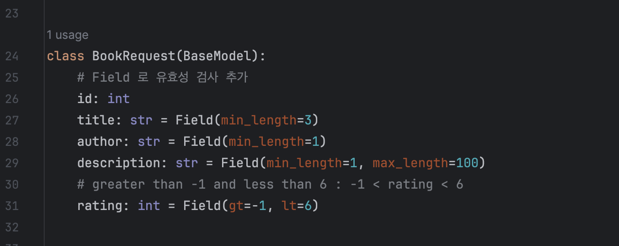 pydantic 에서 Filed 도 임포트합니다. 이는 요청 객체의 필드마다 유효성 검사를 추가할 수 있도록 합니다.