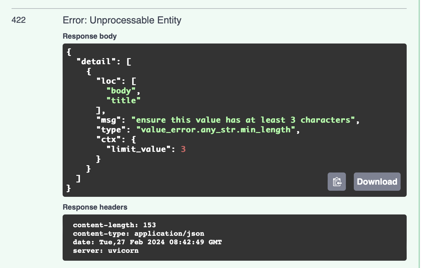swagger 에 접속하면, 만약 title 이 공란일 때(min_length <3)