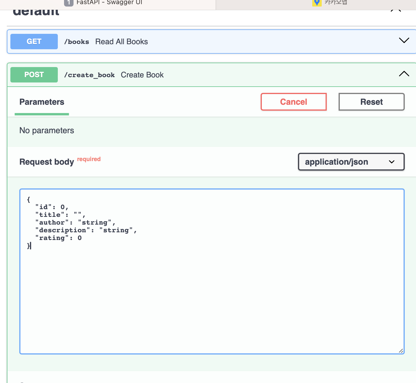 그리고 포스트 요청을 할 때, 요청 모델은 BookRequest 에서 정의한 베이스 모델로 받고, 요청 받은 모델을 ** 연산자를 통해 딕셔너리를 추출하여 Book 클래스의 생성자로 전달할 수 있습니다. 이 객체를 BOOKS 에 추가하면 됩니다.
