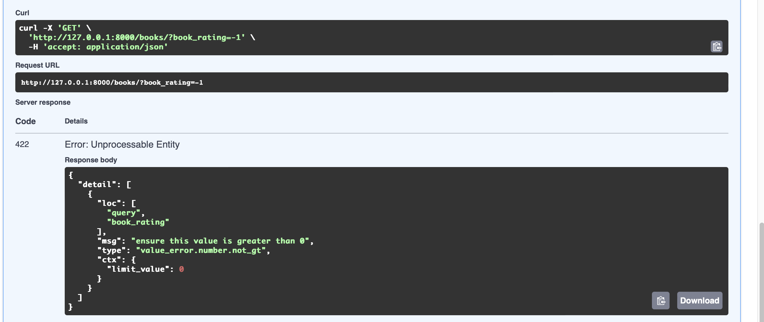 스웨거에서 rating 에 -1을 입력하면 다음처럼 422 에러가 뜬다.