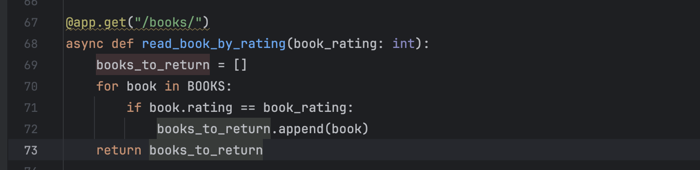 url 은 /books/ 로 지정후 book_rating 을 파라미터로 입력할 수 있게 한 후 전체 BOOKS 중 입력한 rating 과 일치하면 books_to_return 에 담아서 리턴하면 된다.