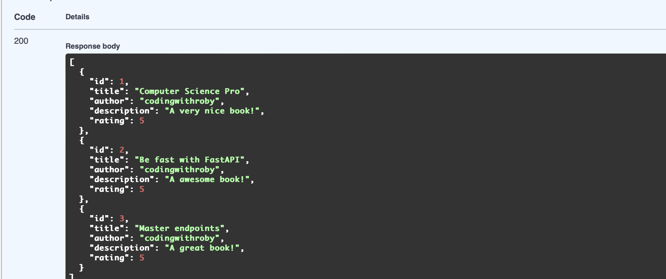 스웨거에서 rating 으로 5를 넣어 테스트한 결과 아래와 같은 출력을 받았다.