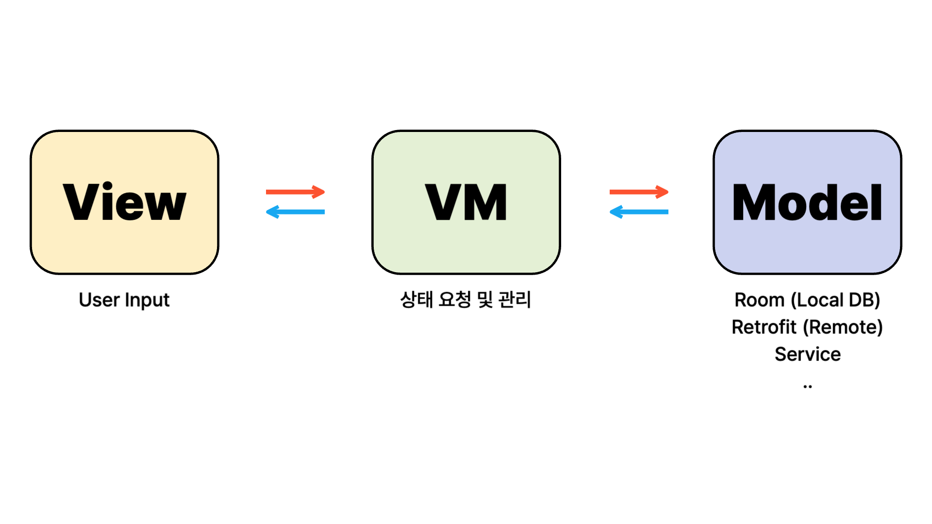 MVVM 패턴에서는 <View, ViewModel, Model(Repository)> 세 가지 레이어를 나누어