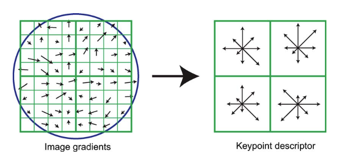 키포인트 descriptor는 방향 히스토그램을 이용하여 생성한다. 4 × 4 샘플 영역에서 방향 이동을 고려하면서 방향을 파악하고 있다. 각 방향 히스토그램에는 여덟 가지 방향이 있으며, 화살표의 길이는 히스토그램 항목 크기를 나타낸다.