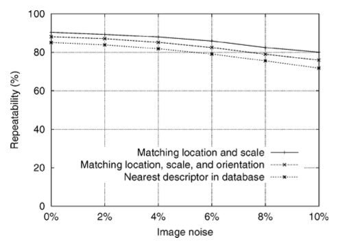 이미지 노이즈가 10%까지 추가가 되어도 95%의 정확도를 가지고 있는 것을 알 수 있다. 위 그래프를 통해 알 수 있듯이 SIFT는 큰 픽셀 노이즈에도 견딜 수 있다. 오류가 발생한다면 그것은 initial location과 scale detection으로 인한 것이다.