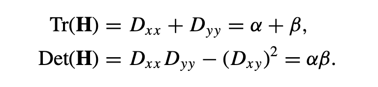 H의 고유값은 D의 주 곡률에 비례한다. 꼭 고유값을 다 찾을 필요는 없고 Trace와 Determinant를 이용해 고유값을 간접적으로 알 수 있다.