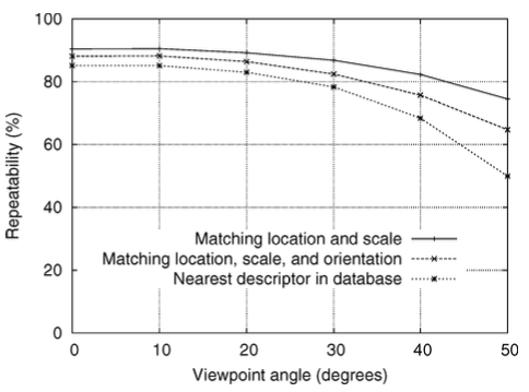 아래 그래프는 affine 변환에 대한 descriptor의 민감도(sensitivity)에 대해 보여준다. Affine 변환이 증가함에 따라 반복성이 감소했지만, 최종 매칭 정확도는 시점이 50도 변경되는 경우에도 50% 이상을 유지함을 알 수 있다.