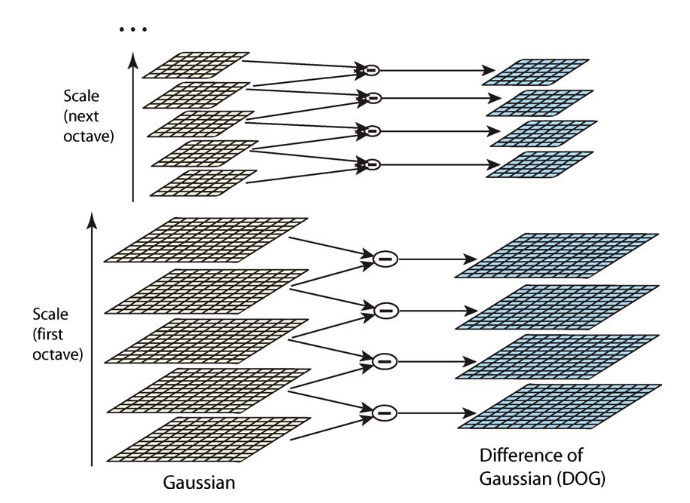 DoG를 만드는 과정은 아래와 같이 초기 이미지에 점진적으로 가우시안을 컨벌루션하여 constant k로 분리되는 이미지를 scale-space에서 생성한다(왼쪽 열). 이 때. scale-space의 각 octave의 간격 정수 s로 나누기로 선택한다. 즉, k=2^(1/s). 각 옥타브에 대해 s+3개의 블러된 이미지를 생성하여 최종 극값 감지가 전체 옥타브를 포괄하도록 해야 한다. 옥타브를 바꿀 때는 σ를 2배하여 down-sample한다. 그러면 σ에 대한 샘플링의 정확도는 이전 옥타브와 다르지 않지만 계산은 크게 줄어든다.