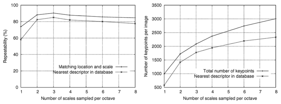 이 때, 우측 그래프를 통해 볼 수 있듯이 scales sampled per octave가 증가할 수록 keypoints의 전체 수도 증가하는 것을 알 수 있다. 더 정확한 결과를 위해 points가 많을수록 좋지만 계산 비용이 증가하므로 이 논문의 실험에서는 옥타브당 3개의 scales sample을 이용한다.
