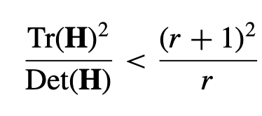 이 논문에서는 r=10을 이용하며, 이는 주 곡률 간의 비율이 10보다 큰 키포인트를 제거한다.