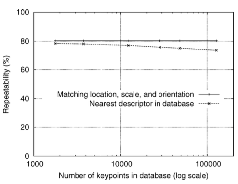 변환된 이미지에서 올바른 매칭 위치와 방향으로 식별된 키포인트의 백분율을 나타내는 실선이 평평한 이유는 각 값에 대해 전체 데이터베이스에서 테스트를 실행했지만, 분산 데이터베이스만 변경했기 때문이다. 두 선 사이의 간격이 작다는 것은 매칭 실패가 초기 특징 지역화와 방향 할당 문제보다는 특징의 독창성 문제보다 발생한다는 것을 나타낸다. 이러한 문제는 매우 큰 데이터베이스 크기에서도 계속된다.