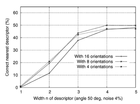 위의 그래프를 통해 n=1일 때는 성능이 매우 좋지 않지만 n=4까지는 성능이 효과적으로 향상했으며, 그 이후에는 왜곡에 민감해져 매칭을 방해할 수 있다는 것을 보여준다. 따라서 이 논문에서는 4 × 4 descriptor with 8 orientations 총 128 dimension을 이용한다. 차원이 다소 높아보일 수 있지만, 저차원 descriptor보다 지속적으로 성능이 더 좋으며 아래에 기술된 nearest-neighbor 방법을 사용할 때 계산 비용이 낮게 유지된다.