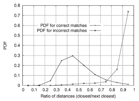 위 그래프는 각 keypoint의 가장 가까운 이웃과 두 번째로 가까운 이웃의 비율로 나타낸 올바른 매치와 잘못된 매치의 확률 밀도 함수(PDF)를 보여준다. Object recognition 구현에서는 가장 가까운 이웃과 두 번째로 가까운 이웃 간의 거리 비율이 0.8보다 큰 매치를 모두 거부하여 거짓 매치의 90%를 제거하고 올바른 매치의 5% 미만을 제거한다. 이와 같은 방식으로 이미지를 처리하면서, 스케일 및 방향 변경, 30도의 깊이 회전, 그리고 이미지에 2%의 노이즈를 추가하여 데이터베이스의 40,000개 키포인트와 매칭시킨다.