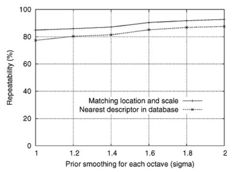 위 그림은 옥타브에 대한 scale-space를 구축하기 전에 각 이미지에 적용하는 smoothing 정도(σ)를 결정하는 실험 결과이다. σ가 증가함에 따라 keypoint 감지의 반복성이 증가하지만, 효율성 측면에서 σ가 크면 비용이 들기 때문에 최적인 σ=1.6을 사용하기로 선택했다.