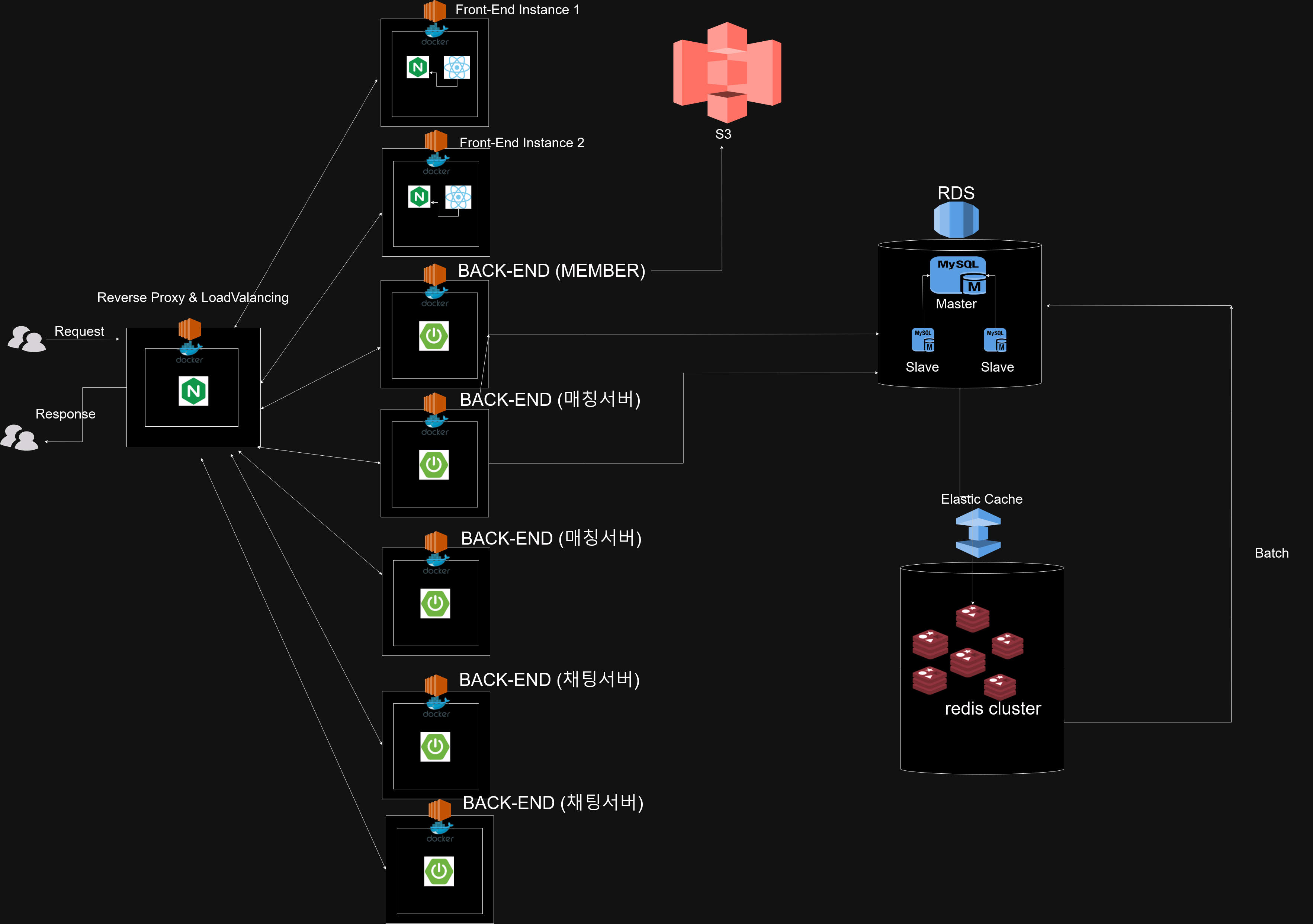 다중인스턴스로 로드밸런싱되고 있는 형태이다. 사람들을 매칭시켜주는 매칭서버가 여러 인스턴스 , 여러 채팅서버 , 회원관리 서버 등 다중서버 환경 및 어느정도 MSA 방식으로 설계되어있다. (완벽한 MSA는 아니다.)예를 들어
