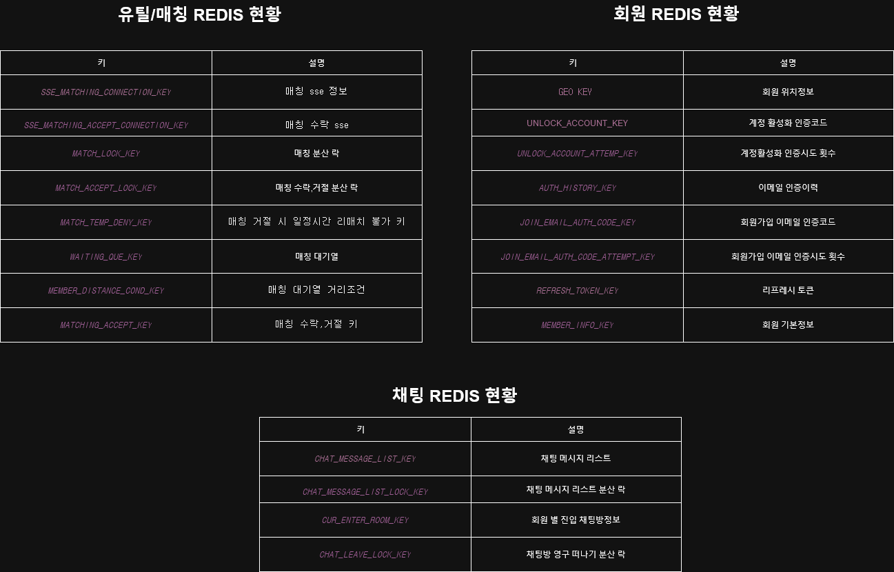 RDBMS + Redis를 활용하되 , 영구저장이 중요하지 않은 작업(분산락, 매칭 등)에는Redis만을 사용하여응답속도 , 부하에 초점을 둠