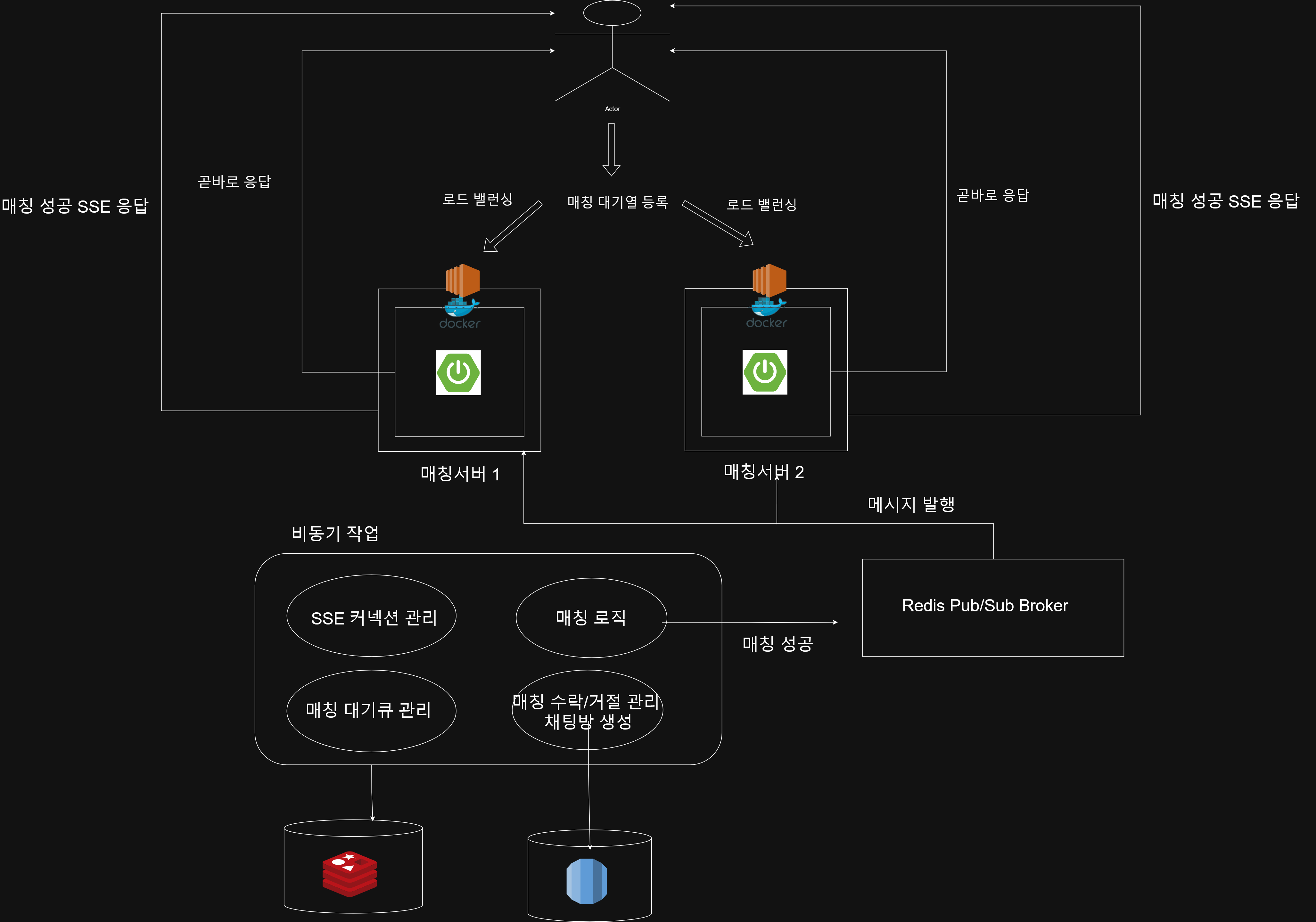 프로젝트의 매칭 대기열 , 매칭 수락/거절을 담당 SSE 커넥션과 Redis Pub/Sub , Redis를 활용하여 매칭대기열을 관리, 매칭알람 매칭대기열 관리 , 매칭 성공 시 채팅방 생성을 담당